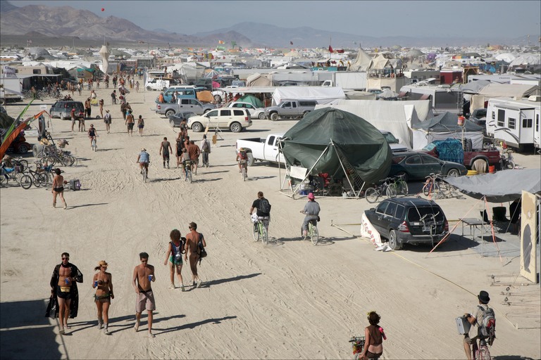 Une fois le précieux pass autour du cou, ou les contrôles de sécurité passés à l’entrée de Black Rock City, chacun s’empresse de regagner son camp, sa tente, son hôtel 4 étoiles, son igloo, son appartement ou sa chambre d’hôte selon. Cannes est une ville qui ne semble vivre qu’au rythme des évènements internationaux, régulièrement agitée par des soubresauts de paillettes et de costumes trois pièces. Black Rock City est une ville de 50 000 habitants au milieu du désert qui prend vie une fois par an avant de redevenir poussière de sable. Chacun installe et décore son camp ou son stand. On gare les voitures, on monte les tentes et on part repérer les lieux. À Black Rock City, les rues ont des noms évocateurs : Evolution, Darwin ou Initiation. On se promène avec des goggles et un grand foulard comme dans Mad Max pour parer à toute tempête de sable éventuelle. Au MIPIM, les stands sont numérotés de manière incompréhensible : E28A, G34bis, mezzanine du 2ème entresol. On se promène les mains pleines de cartes de visite et de brochures à distribuer à tout va. Dans les deux cas, le troc est au centre des relations humaines : je te file une bière tu me files un collier phosphorescent, je te donne un book tu me donnes une invitation pour une soirée hype.