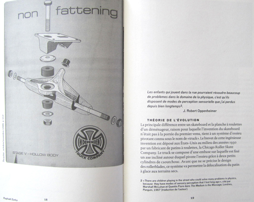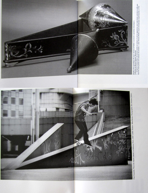 DISCOURS DE L’HÉTÉROGÈNE. Artiste, skateur, théoricien, archéologue, collectionneur, l’auteur nous embarque dans un monde de relations insoupçonnées entre le skateboard, la sculpture minimale des années 1960, les outils de mesure ancestraux et les piscines vides californiennes. D’où son sous-titre en forme de cadavre exquis : « Skateboard, mécanique galiléenne et formes simples ». On part donc pour une visite guidée inédite des terrains de jeu des skateurs. Depuis « Dogtown & Z-boys » (documentaire de Stacy Pelatra, 2001), on savait que le skate a été inventé par des gamins californiens en mal d’océan. Pour retrouver les sensations de glisse même les jours sans vagues, ils ont mis des roulettes sous leurs planches et en avant l’aventure dans les rues en pentes des collines de Los Angeles, les pipes en béton abandonnés et autres volumes skatables. On est encore loin d’imaginer que ce livre sur le skate va nous emmener de vagues pétrifiées en voyage sur la lune, et de géométrie urbaine en science sensible des matériaux…