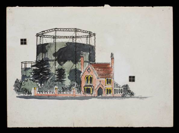 Hugh Casson, Gazome tre-camoufle et cottage perspective, 1944 (Victoria & Albert Museum, Londres – Archives of Sir Hugh Casson and Margar et MacDonald Casson)