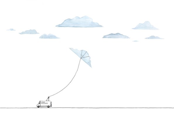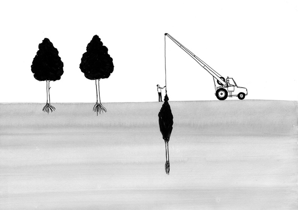John Brinckerhoff Jackson explique que le paysage est le lieu où les hommes peuvent enfin accélérer ou ralentir les processus naturels. Croissance, maturité ou déclin ne sont plus calqués sur le rythme de la nature mais sur celui de l’homme. Alors, plutôt que de devoir attendre des années que l’arbre atteigne sa taille adulte, les manutentionnaires de « Growing » font pousser les arbres en tirant dessus avec un camion-grue. Cette opération paraît aussi simple que de sortir un kleenex de sa boite ! Entre poésie de l’absurde et scénario d’anticipation, les dessins de Vincent Broquaire questionnent notre soif de contrôler la nature, dans un monde qui se technologise à toute allure. (Comment ne pas voir dans « Growing » une allusion aux manipulations génétiques faites sur les végétaux permettant à telle fleur de ne pas faner ou à tel arbre, peut-être un jour, de sortir de terre avec déjà sa taille adulte ?)