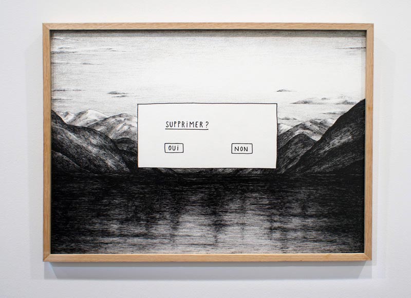 Revenons au lac de montagnes que l’on nous propose de supprimer. Ce dessin s’intitule « Entrée en dialogue ». Sans présumer des intentions de l’auteur, le dessin confronte deux extrêmes. À la définition classique du paysage comme « vue d’un décor naturel, ou peinture évoquant une telle scène »[1] (le dessin du lac et des montagnes) vient se surimposer le contrôle informatique d’une nature gérée à distance et de manière impersonnelle par ordinateur (l’écran de commande).