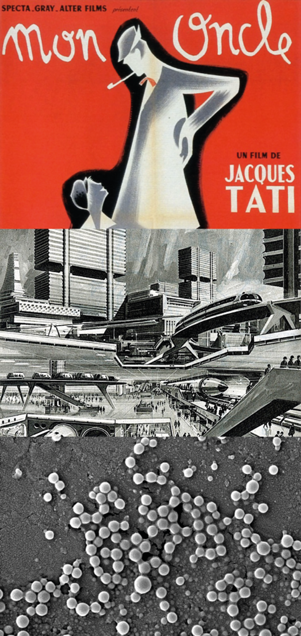 1/ Mon Oncle, Jacques Tati, affiche du film, 1958 2/ Dessin prospective urbaine, via http://transit-city.blogspot.fr/ 3/ Nanoparticules, INSERM